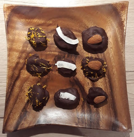 Hiervoor kan je allerlei kanten op. Gebruik ingrediënten die je zelf lekker vindt. Je kan de bonbons met kokosrasp bestrooien of met cacao. Fijngemalen nootjes en kokossnippers doen het ook goed. Als je biologisch / dynamische citroen en/of sinaasappel hebt, kan je ook de schil hiervan raspen en die over de chocolade draperen. De mogelijkheden zijn (bijna) eindeloos.